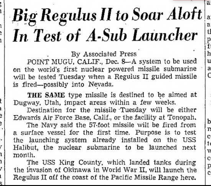 Also on December 9, a U.S. warship offshore Los Angeles fired a nuclear warhead-capable Regulus II missile over the city towards Nevada, it was a successful test. Here's a December 8 report previewing the launch: