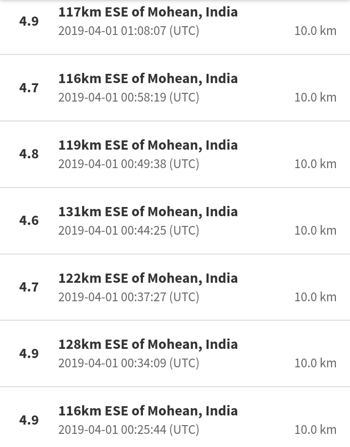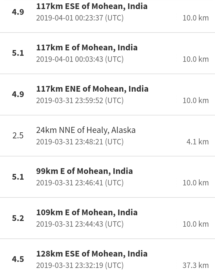 The magnitude 5.5 quake was the strongest of more than 40 magnitude 4+ earthquakes to hit that epicenter since 6:32:20 p.m. CDT Sunday March 31, 2019--and 6:32 p.m. is awfully close to the time of 6:37 p.m. CDT which I mentioned repeatedly.