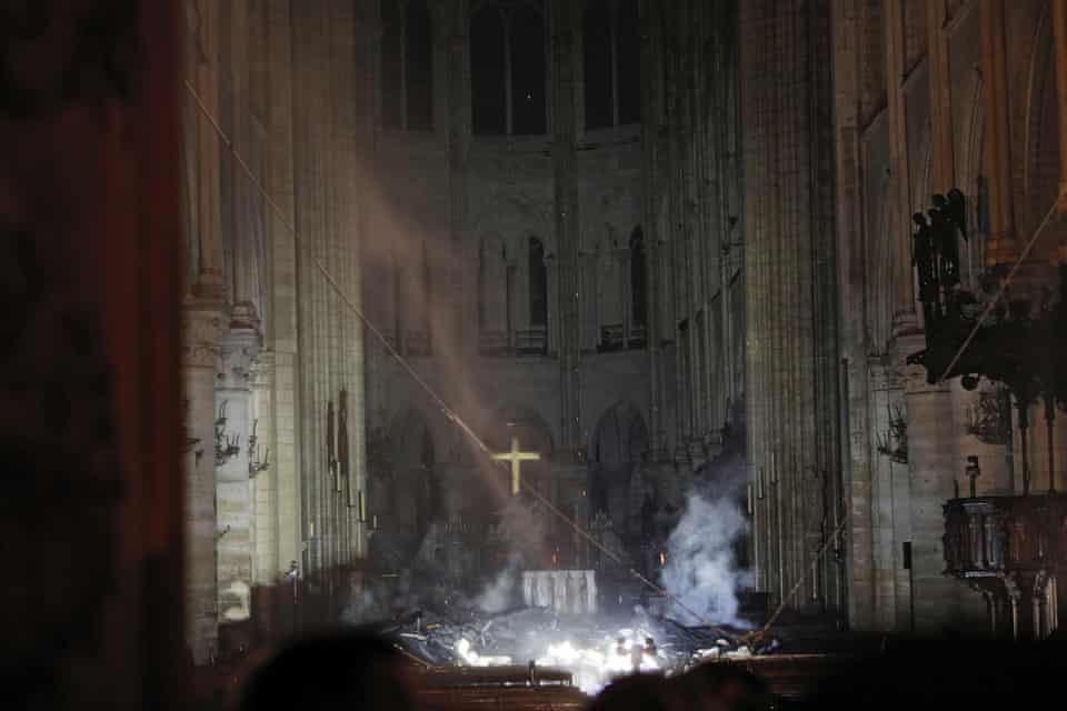 BNL News tweeted: Interior of Notre Dame Cathedral still pretty much intact. Pulpit, part of the Alter still intact. Cross still standing