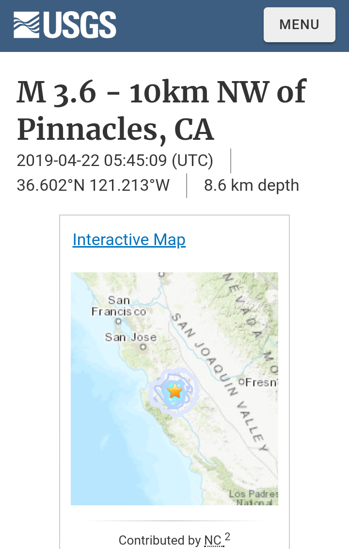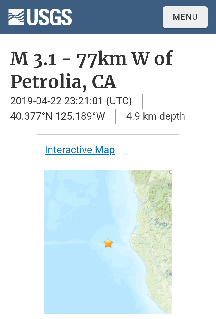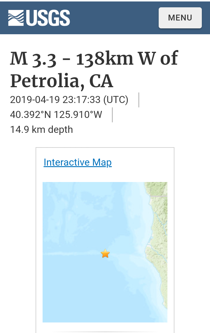I actually wondered what activity might happen around 12:45 a.m. today April 23rd, because of...well, for two reasons, first, a significant quake in Pinnacles National Park California at 12:45 a.m. CDT Monday April 22, 2019 was followed by a significant quake offshore north northeast Japan at 12:45 p.m. CDT Monday April 22, 2019: