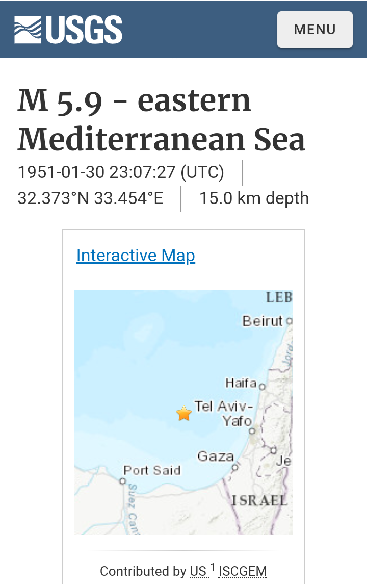 Ten times 364 days previously (14×260 days) a totally unusual big earthquake struck offshore the nations of Egypt and Israel, at 6:07 p.m. CDT Tuesday January 30, 1951. There is more which could be said about that earthquake, but I will just point out it was 89×280 days ago tonight at 6:07 p.m. CDT and leave it at that.