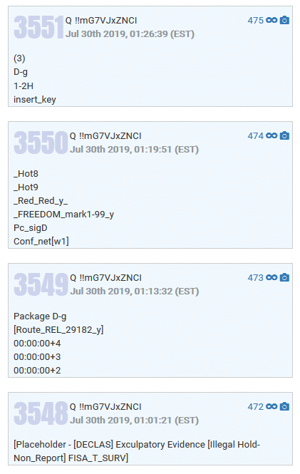 Above is screen cap from https://qanon.news/q showing the cryptic posts 472-475. Perhaps these are operational comms.