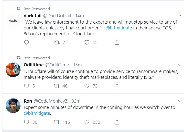 8chan is now using BitMitigate as its DDoS protection service, after Cloudflare dropped them Posted By: MrFusion