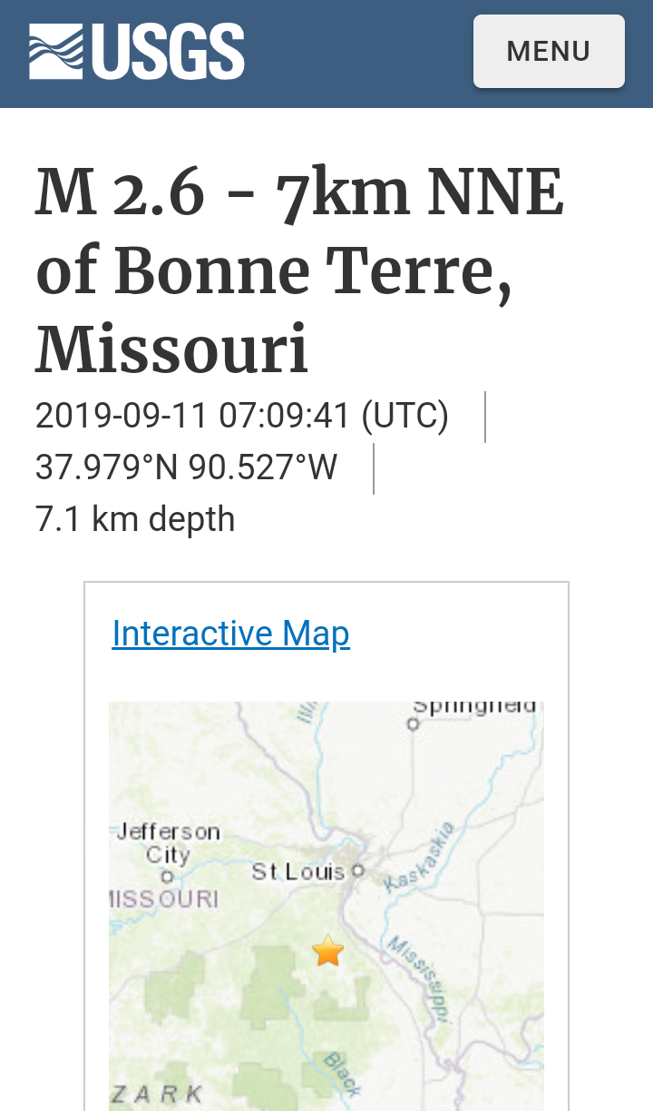 Reviewing current earthquake data, I see that a felt earthquake shook Potosi, Missouri where the State's "Death Row" prison is located, at 2:09:41 a.m. CDT this morning, magnitude 2.6: