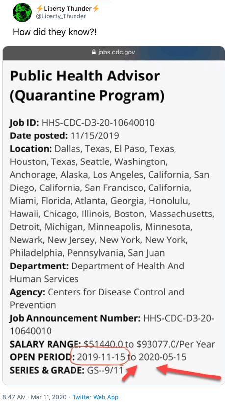 HHS/CDC Job Posting for Public Health Advisor (Quarantine Program) valid to May 15, 2020