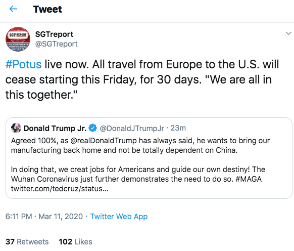 TWEETED: All travel from Europe to the U.S. will cease starting this Friday, for 30 days