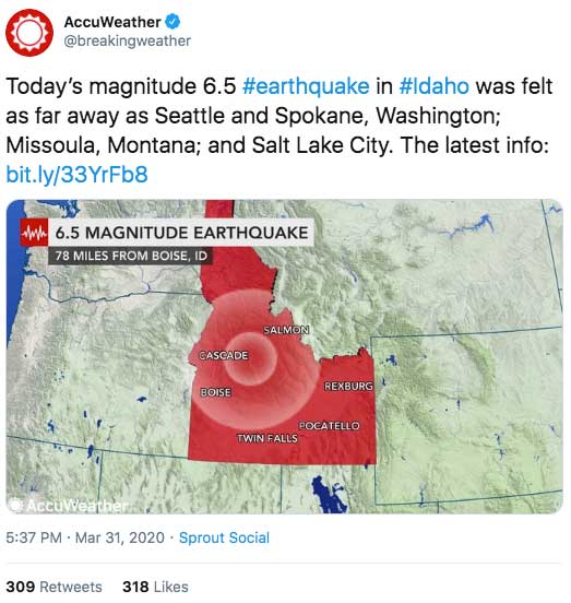 Today’s magnitude 6.5 #earthquake in #Idaho was felt as far away as Seattle and Spokane, Washington; Missoula, Montana; and Salt Lake City. The latest info:
