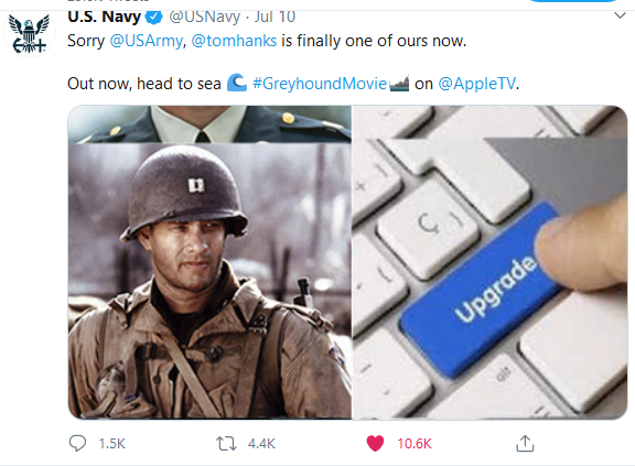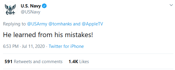 Seems to be a reference to Hanks's newly released film, "Greyhound"