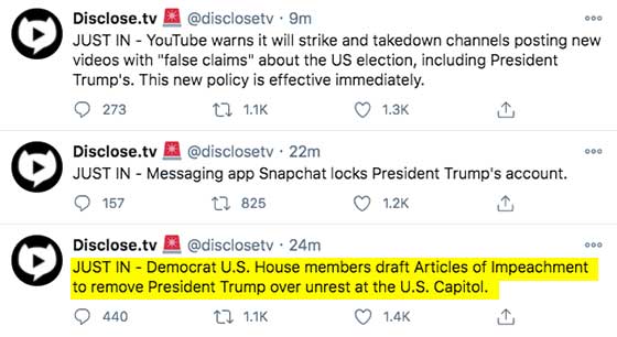 Disclose.tv: Democrat House members draft Articles of Impeachment to remove President Trump over unrest at the U.S. Capitol Posted By: NaturalWisdom In Response To: TWEET: Pence’s Chief Of Staff Marc Short Says He Was Denied Entry Back Into The White House (NaturalWisdom)
