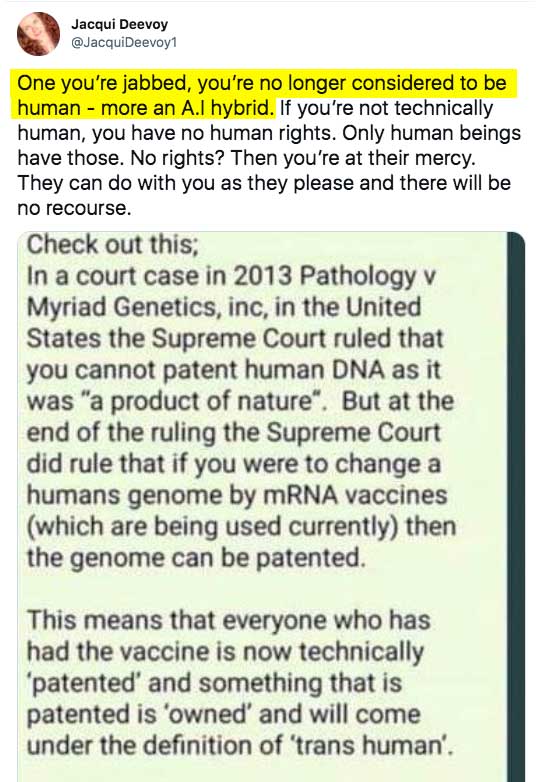 TWEETED: Once you’re jabbed, you’ve become an A.I. hybrid who no longer has human rights because you are technically not human Posted By: NaturalWisdom