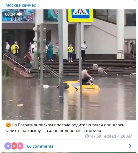 The cab driver had to climb on the roof at Bagrationovsky Proyezd - the interior was completely flooded