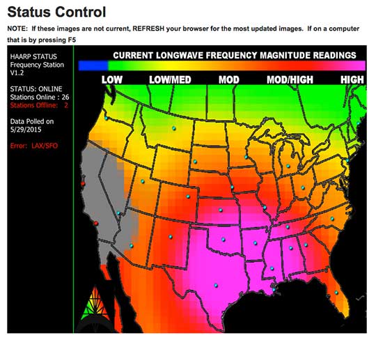 Also notice that all of California and parts of Arizona and Nevada are greyed out (data unavailable) on this HAARP Status Report map for May 29th, while Texas and much of the Gulf Coast display the highest reading (color-coded purple).