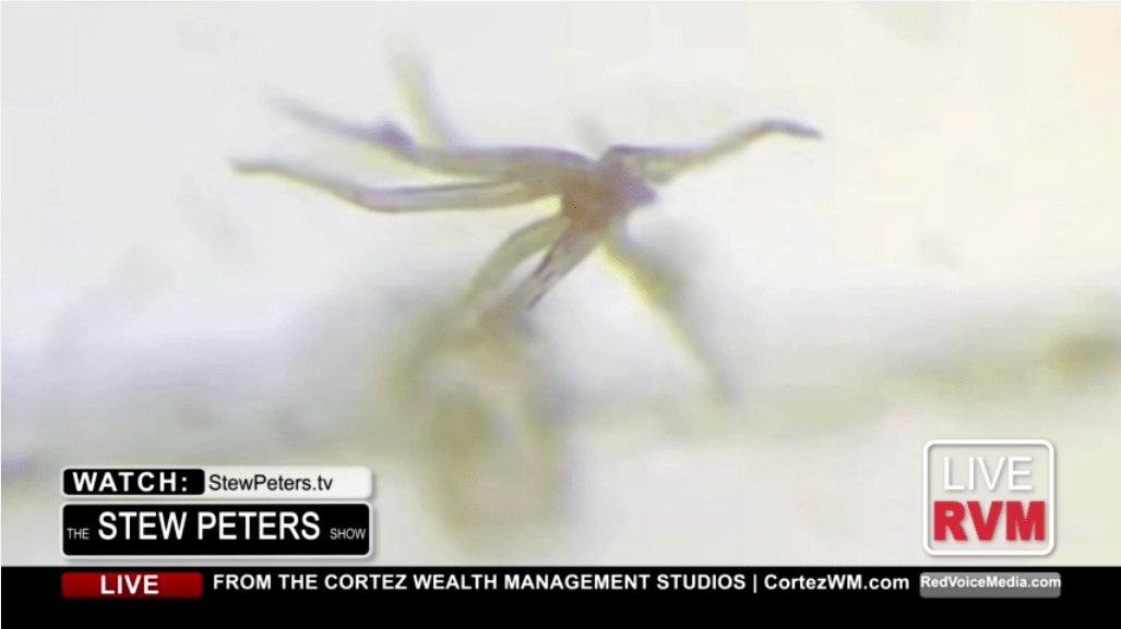 Parasite that may have been identified as “hydra vulgaris” has been seen in the COVID vaccine. Pic credited to The Stew Peters Show and Dr. Carrie Madej.