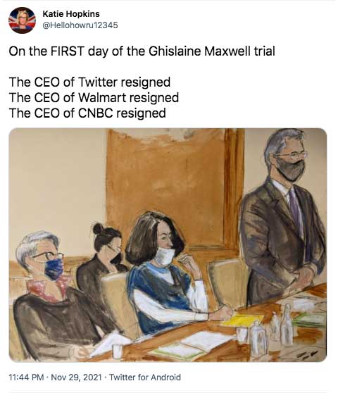 On the FIRST DAY of the GHISLAINE MAXWELL TRIAL, the CEO's of TWITTER, WALMART & CNBC all RESIGNED!!!