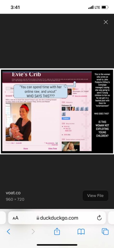 In an e-mail sent to John Podesta and several of his friends cc’d in 2015, Tamera Luzzatto wrote that children would be Uber’d to their pool party for “entertainment” purposes. The name & ages of three children were listed in the e-mail. These names also popped up on a disturbing password-protected site, run by Luzzatto, called Evie’s Crib. The blog tagline read you could view infants “raw and uncut”. The site also had sexually explicit tab titles and linked to another disturbing site, Jack’s blog, that advertised that unrated versions of naked babies were available to premium subscribers.