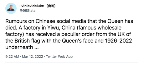 Rumours on Chinese social media that the Queen has died. A factory in Yiwu, China (famous wholesale factory) has received a peculiar order from the UK of the British flag with the Queen's face and 1926-2022 underneath