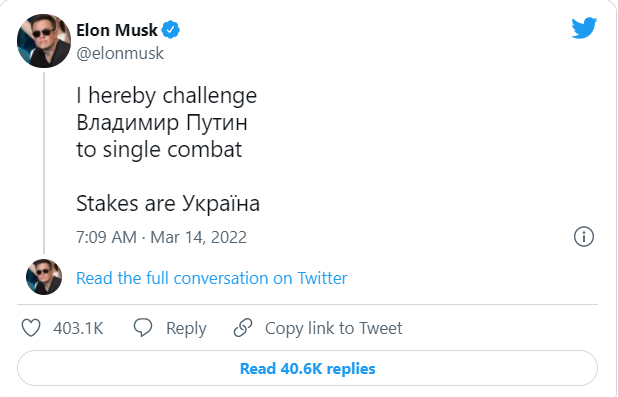 Putin’s comment referred to a March 16 Tweet by Musk:
