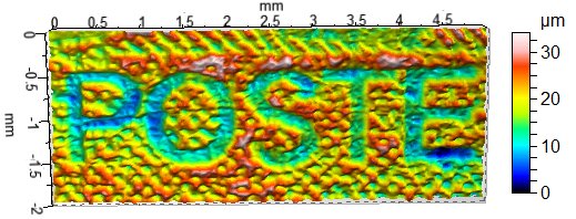 Micro-topography of an ordinary French post stamp (detail) showing the thickness of ink obtained by intaglio. The words "la Poste" appeared in white on red background and hence corresponds to areas with a lack of ink.
