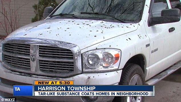The black, oily substance first appeared on at least six driveways in Harrison Township, Michigan, on Sunday