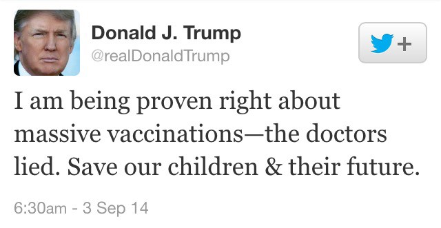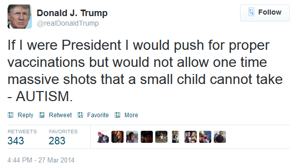 Donald Trump has publicly spoken out about the dangers of vaccinations, and has said he believes that vaccines cause autism.