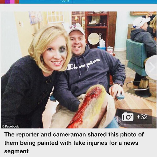 “The reporter and cameraman shared this photo of them being painted with fake injuries for a news segment,” the Mail remarks.