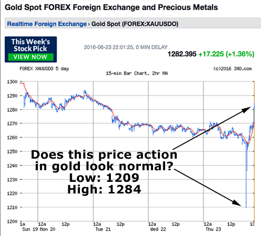 On Brexit referendum day, the SPOT GOLD price careens from a low of 1209 to a high of 1284