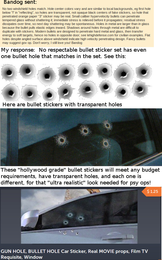 Bandog surprised me with his message, where he still believed the bullet holes were real. But when you compare the windshield holes in THIS PICTURE and match them up with hollywood bullet set #3, MY GOSH WE HAVE A MATCH!