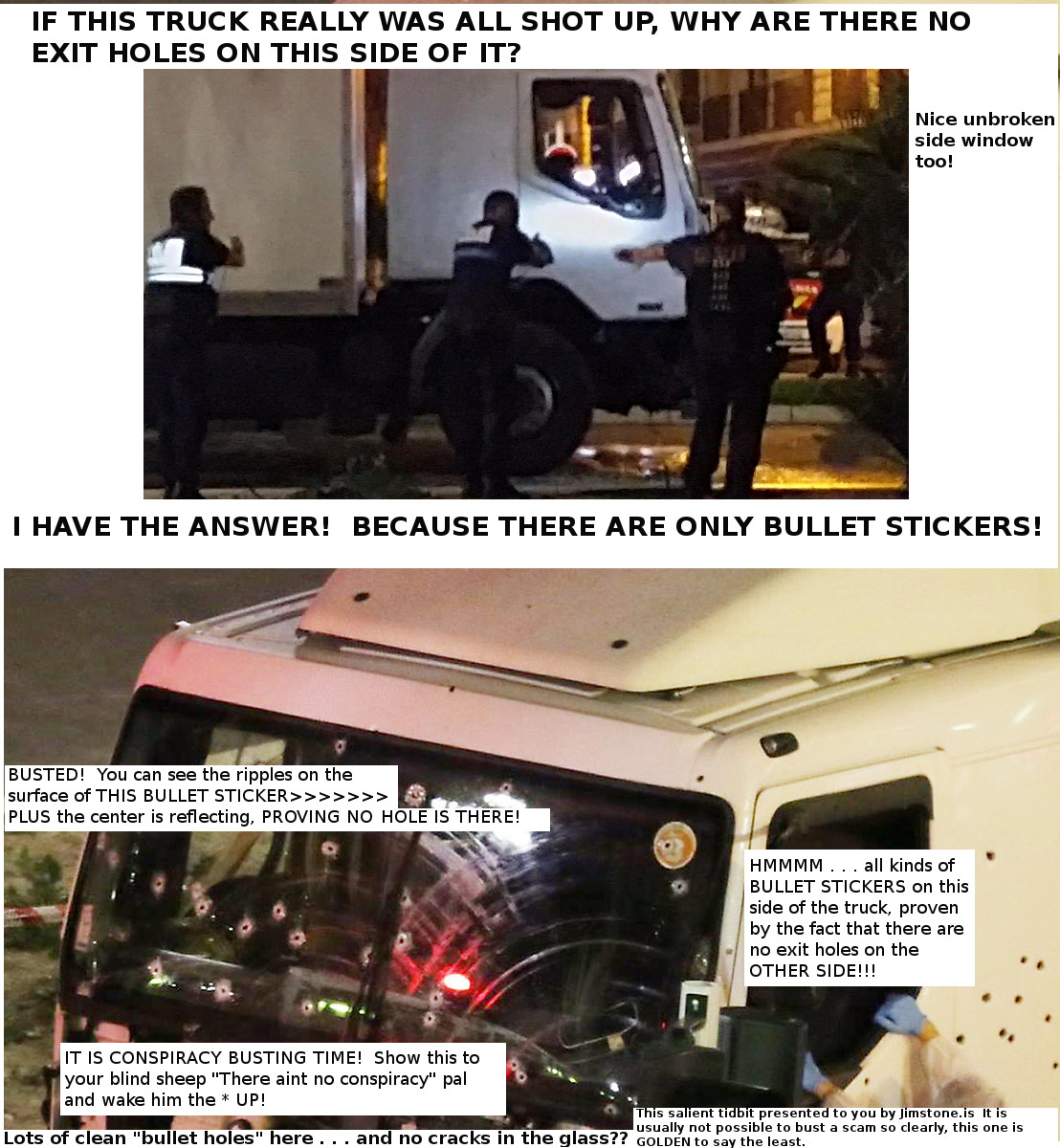 UPDATE: The truck driver rampage in France story has multiple gaping holes which I will briefly mention here: 1. No second party cell phone coverage despite 40,000 people present. Also nothing from people on balconies who were far enough away from the action to cover it with real cameras. 2. No first responders, relatives or anyone else with the dead bodies more than a half hour after the carnage started, with the truck sitting there with windows shot. NO FIRST RESPONDERS FOR OVER A HALF HOUR? NO POLICE MOB? EVEN LONG AFTER EVERYTHING WAS COMPLETELY SECURED? Just photo op bodies laying there. YEP. STAR WARS HAPPENED. It looked so real. I never saw an ambulance in Star Wars either. -SORRY- breaking the window on the next day to support the hoax won't cut it, when the cracks are not consistent with the "bullet holes"! .