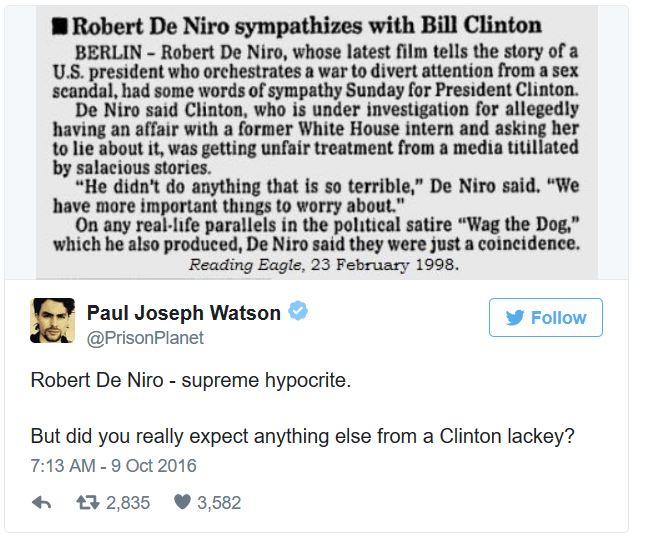On Saturday, Robert Deniro released a video ad slamming Donald Trump for his 2005 lewd comments about woman. But while Bill Clinton was in the oval office Deniro had a different tune.