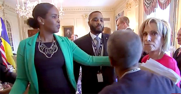 Mitchell attempts to extract her revenge, though, in her snarky report afterwards. She shares the indignation she was just forced to endure with the spattering of libs at home receiving a portion of their daily garbage delivery. How dare the State Department not only refuse to cater to her, but accept a less prominent role than what she deems proper and tolerate being downsized. Bigger government is better; everybody should know that by now.