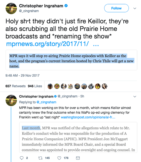 MPR said it received a single allegation last month, from a person who worked with Keillor while he was producing A Prairie Home Companion. The station’s spokesperson said that allegation led to the creation of a special committee of the network’s board and the hiring of an outside law firm to conduct an investigation.