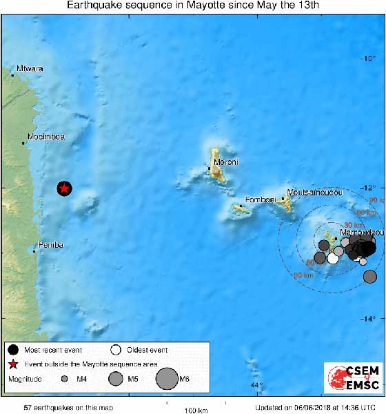 Distribution of the 57 earthquakes collected by the EMSC between May the 13th and June 6th in the region of Mayotte. The event west of Comores M5.0 is probably not part of the sequence but it has been felt in Mayotte.