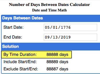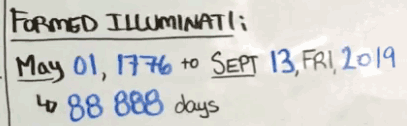FUN WITH NUMBERS: The ELAPSED TIME between the FOUNDING of the ILLUMINATI on MAY 1, 1776 and SEP 13, 2019 is 88,888 DATS Posted By: NaturalWisdom In Response To: This week's calendar is characterized by Friday the 13th and the 18th anniversary of 9/11. Do the globalists have something big planned? (NaturalWisdom)