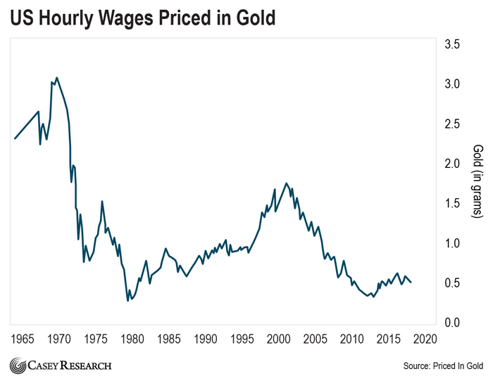 The next chart illustrates this dynamic. It measures US hourly wages priced in gold grams (the number of gold grams the average person’s hourly income could buy).