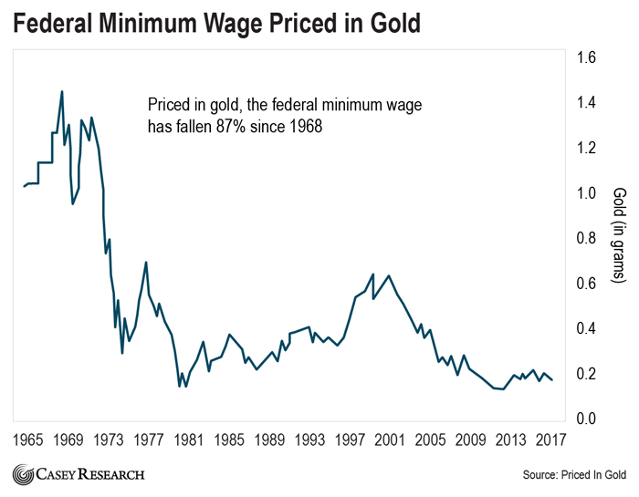 The next chart measures the federal minimum wage in terms of gold grams. Priced in gold, the minimum wage has fallen 87% since 1968.