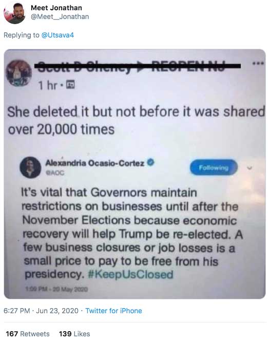 TWEET: She (@AOC) deleted it but not before it was shared over 20,000 times - Also reported by Jim Stone Posted By: NaturalWisdom In Response To: Hoax: Re: AOC Admits The Virus Is A Hoax To Use Against President Trump! (JediShaman)