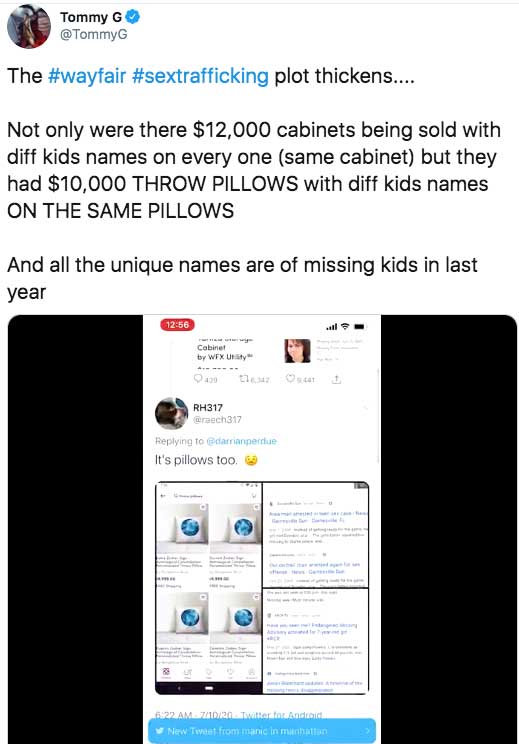 #wayfair: $12k cabinets & $10k throw pillows were sold with different kids' names on them, and the unique names are of missing kids Posted By: NaturalWisdom In Response To: Debunking article rapidly posted at Newsweek (MrFusion)