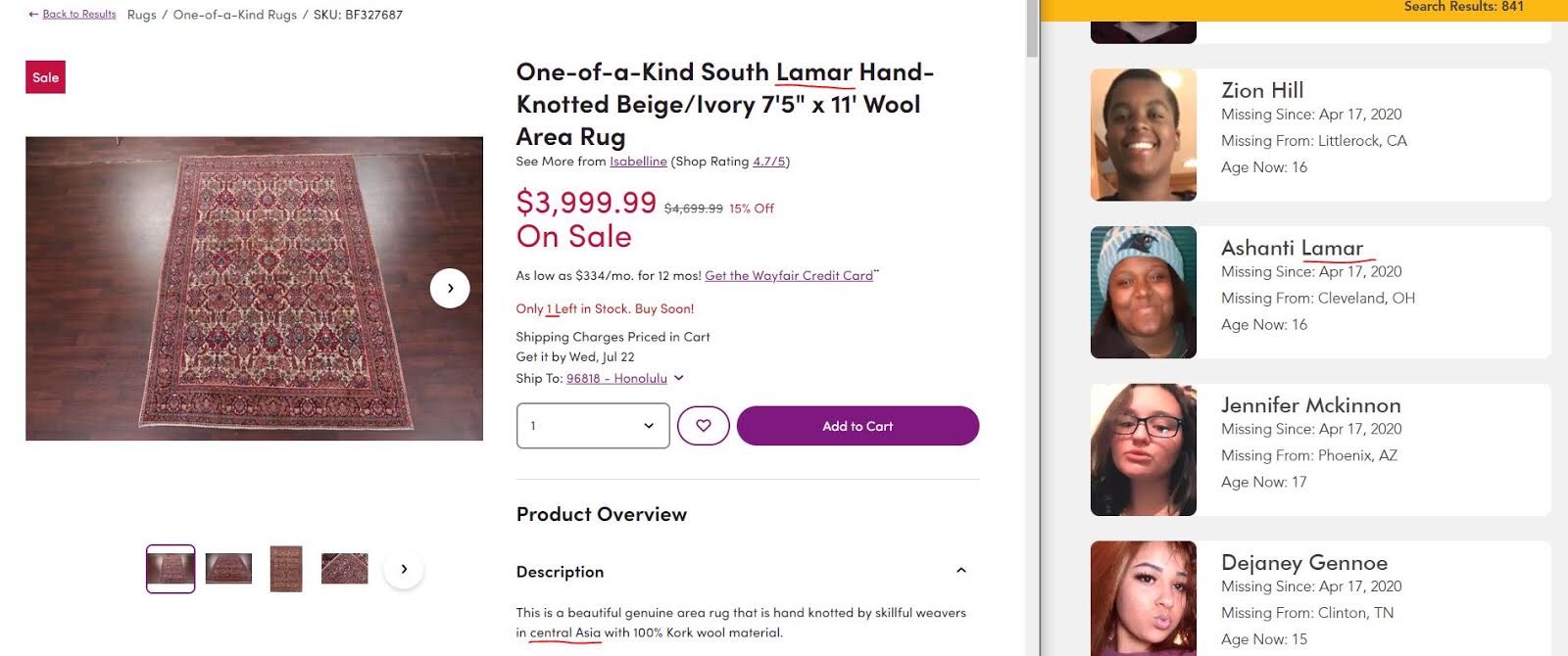 MISSING CHILDREN END UP AS CHANDELIERS AND RUGS FOR SALE ON WAYFAIR, HANX ORDER!