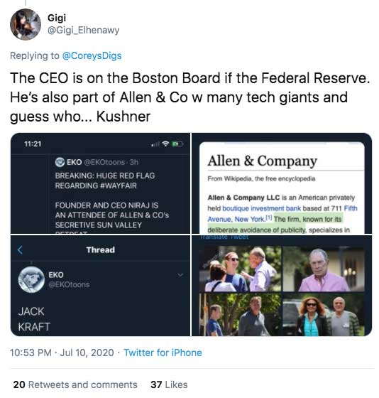 - Wayfair's CEO sits on the Federal Reserve Bank of Boston's board, attended Allen & Co's secret retreat and allegedly is linked to Kushner