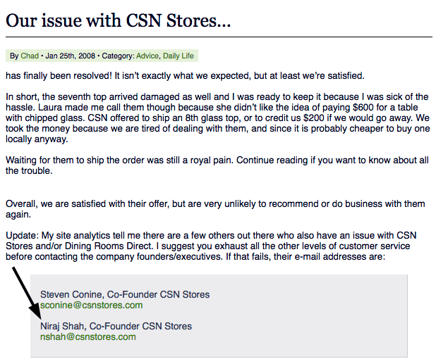 Update: My site analytics tell me there are a few others out there who also have an issue with CSN Stores and/or Dining Rooms Direct. I suggest you exhaust all the other levels of customer service before contacting the company founders/executives. If that fails, their e-mail addresses are: