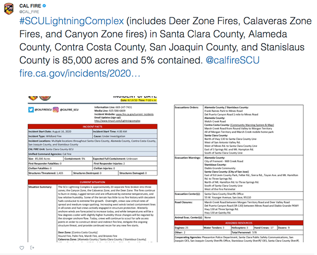 #SCULightningComplex fires have burned 85,000 acres and is only 5% contained. Due to heavy traffic, the CAL FIRE home page is unavailable.