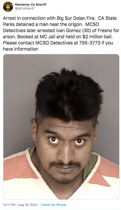 Arrest in connection with Big Sur Dolan Fire. CA State Parks detained a man near the origon (sic). MCSO Detectives later arrested Ivan Gomez (30) of Fresno for arson. Booked at MC Jail and held on $2 million bail. Please contact MCSO Detectives at 755-3773 if you have information