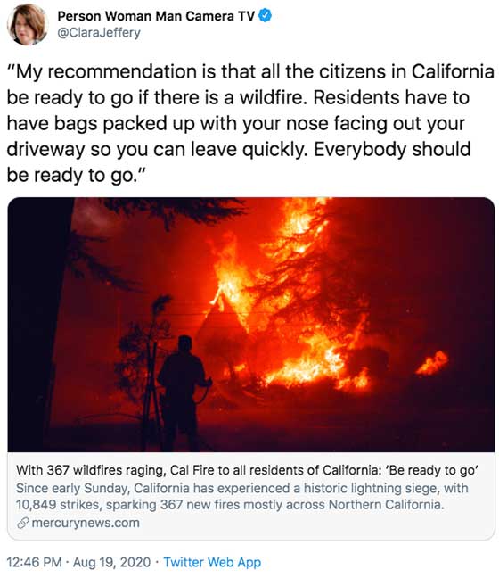 Tweet: All Californians should be ready to go if there is a wildfire. Residents should have their bags packed so they can leave quickly