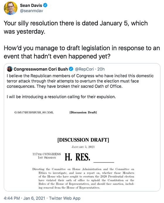 - Cori Bush (D-Mo) submitted resolution calling for expulsion of Republican members of Congress. Her resolution is dated Jan 5th, not the 6th
