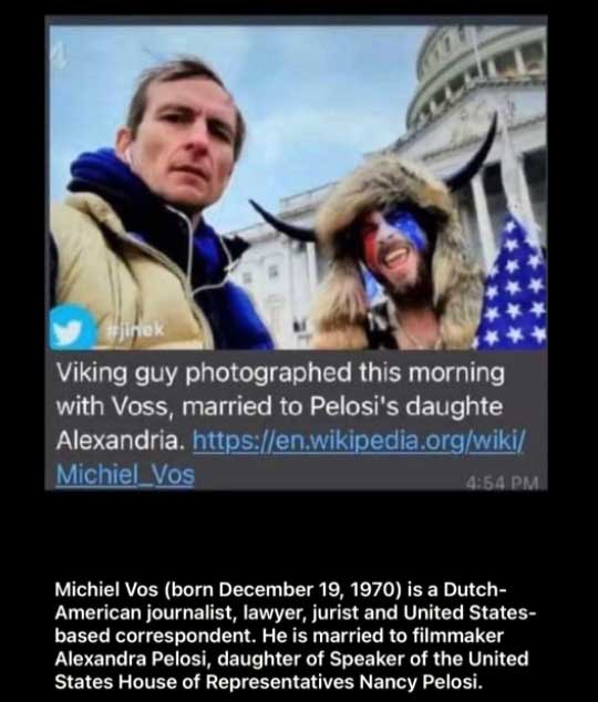 Michiel Vos (Pelosi's son-in-law) photographed in front of the Capitol building with the Viking actor, Jake Angeli Posted By: NaturalWisdom In Response To: Patriots rallied, Antifa and its handlers created an incident, and Mike Pence betrayed us (CrystalRiver)