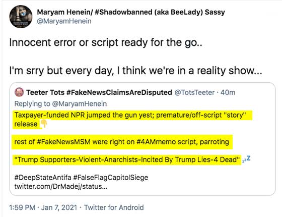 Taxpayer-funded NPR jumped the gun yesterday with their premature story release about DC anarchists that other #FakeNews outlets parroted Posted By: NaturalWisdom In Response To: Antifa did it folks: You can hear the crowd booing and demanding this person stop breaking the window at the Capitol in this video :35 (HotCoffee)
