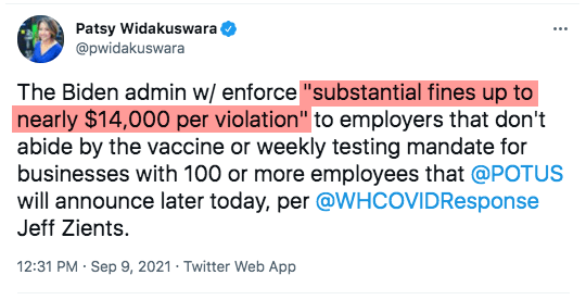 Biden admin will enforce fines up to $14,000 per violation to employers with 100 or more employees that don't abide by the vaccine or weekly testing mandate Posted By: NaturalWisdom In Response To: Methodist Health System in Texas faces lawsuits for illegally denying covid vaccine exemptions (CrystalRiver)