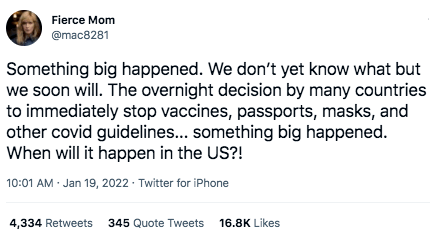 Tweet: SOMETHING BIG HAPPENED (overseas). WE DON'T YET KNOW WHAT BUT WE SOON WILL. WHEN WILL IT HAPPEN IN THE US? Posted By: NaturalWisdom In Response To: UK Ends Vaccine Passports, Mask Mandates, as Prime Minister Faces Calls for Resignation (CrystalRiver)