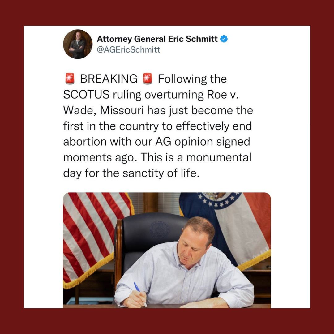BREAKING! MISSOURI AG SCHMITT JUST ENDED ABORTIONS! Posted By: jensingr In Response To: Breaking:Supreme Court overturns Roe v. Wade; states can ban abortion . (CrystalRiver)