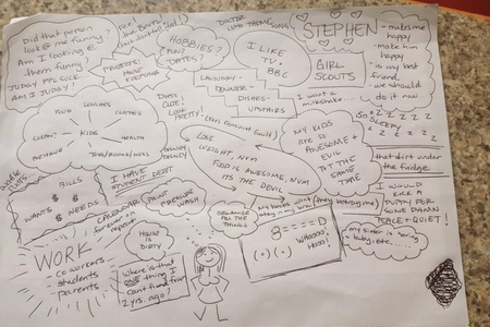 Saying "should you draw it all?" here's what he got in a literal sense. The woman took a piece of paper and drew a detailed "map" depicting what was currently in her head.